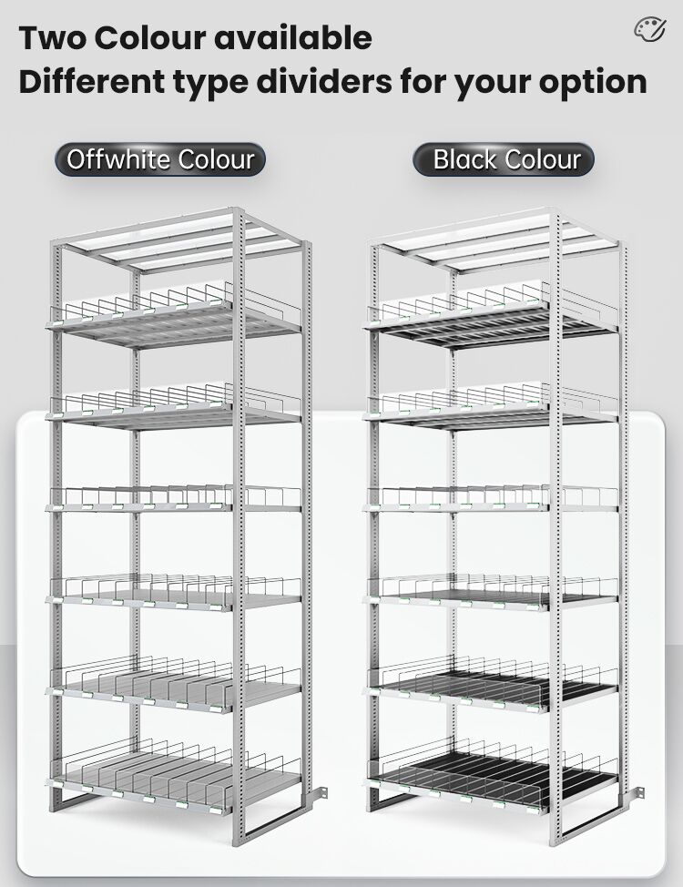 - Customization Options: The aluminum dynamic Rolling Shelving system allows for customization to meet specific requirements. It can be tailored to accommodate different shelf sizes, weight capacities, and configurations, making it suitable for a wide range of products and storage needs.