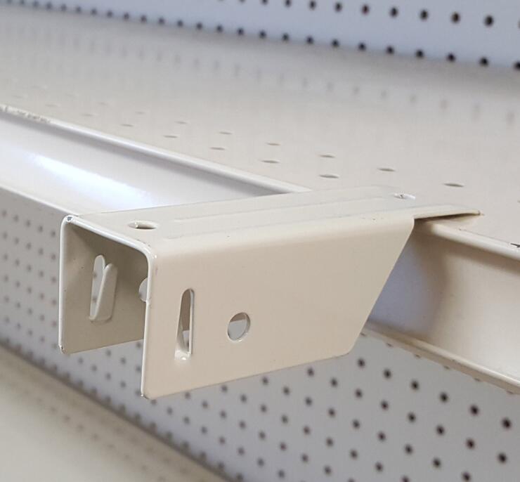 Shelf top hanger that offers two ways to hang merchandising strips two at a time for double the exposure: with integrated hanger tabs, or via the side holes with common “S” Hooks (sold separately) and/or metal hook-style merchandising strips (also sold separately). Easily fits into most perforated shelf holes. Extends into the aisle to capture customers’ attention. Metal offers more strength and durability than plastic or wire shelf top merchandising strip hangers. Removable and reusable.